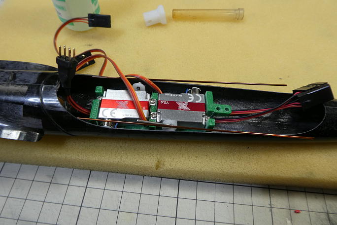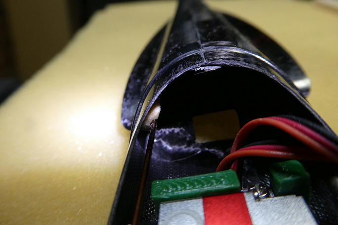 ![]() ラダー、エレベーターの動翼のニュートラルとサーボのニュートラルを合わせて、ロッドを切断します。 切断したロッドの端10ミリ程をサンディングして脱脂しておきます。 ニュートラルを保ちつつ、ロッドエンドとカーボンロッドを低粘度瞬間接着剤で接着します。 ![]() ロッドの振れ止めに、溝を付けた3ミリバルサで作ったサポートを製作しました。 ![]() この辺り、サポートフリー部分のほぼ中央に接着します。 ![]() 受信機とバッテリーを納めました。 もう少し前に出せたのですが、バッテリーが心配だったので、このあたりで勘弁 してあげました。 その代償でバラストホルダーの穴が一つ犠牲になりました。 |