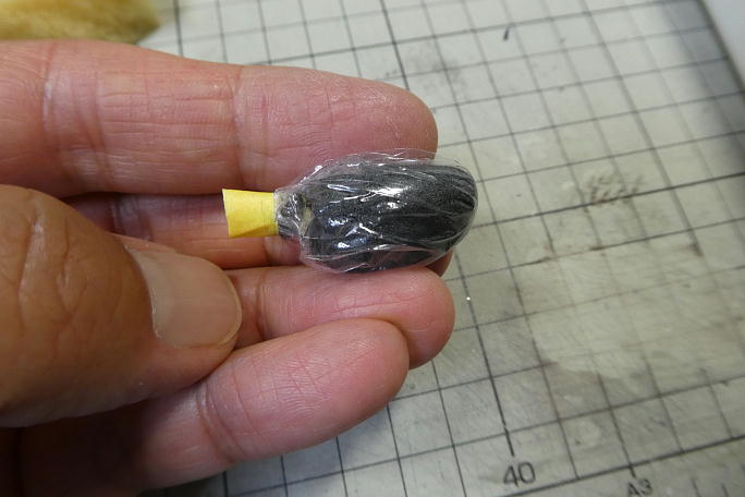 ![]() 重心位置を測定したところ、重心位置を68.5ミリにするには16グラムのノーズバラストが必要となりました。 ![]() ![]() 16グラムの鉛パウダーに5分エポキシを少量まぶして、ラップの上で合計が16グラムになるように計測します。 ![]() ラップを丸めて、柔らかい内にノーズに押し込んで棒などで突いて馴染ませます。 これでノーズの形状ピッタリのバラストに なります。 |