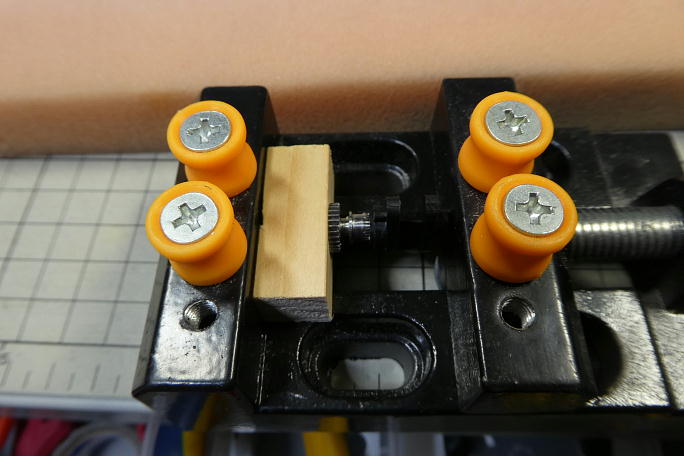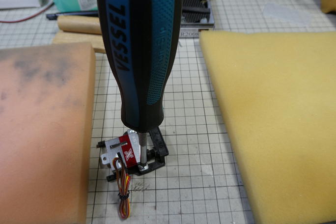 ![]() IDSホーンをサーボの軸に挿入するのは大変力を掛ける必要が有り、サーボに直に入れるのを躊躇する事もあります。 温めると入れやすくはなりますが、サーボが可哀想な気さえします。 サーボのスペアギヤを購入して、一度この様にスペアギヤのファイナルギヤを万力で押し込んでから「ホンちゃん」の サーボに挿入する事にしてみました。 ![]() ニュートラルの1520μsで1スプライン分オフセットしてサーボホーンを取り付けます。 |