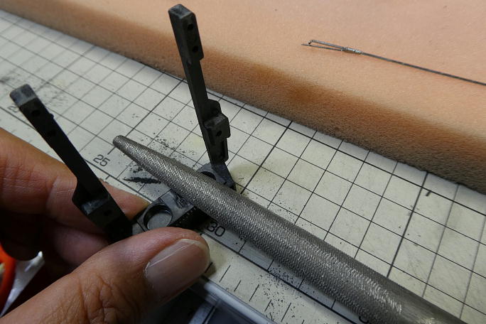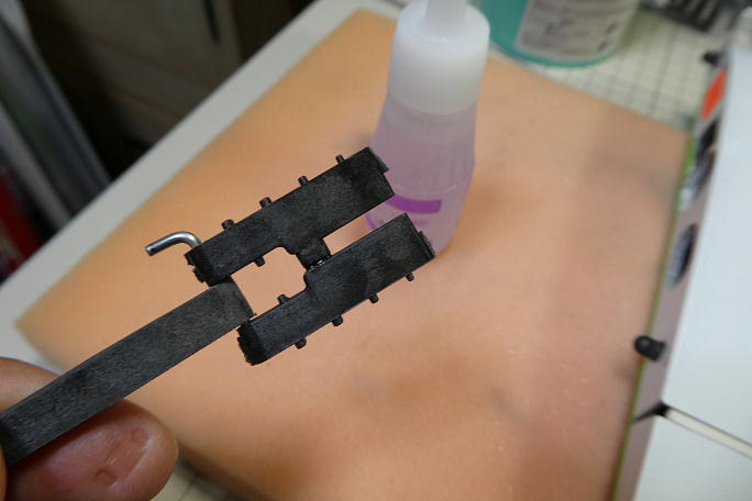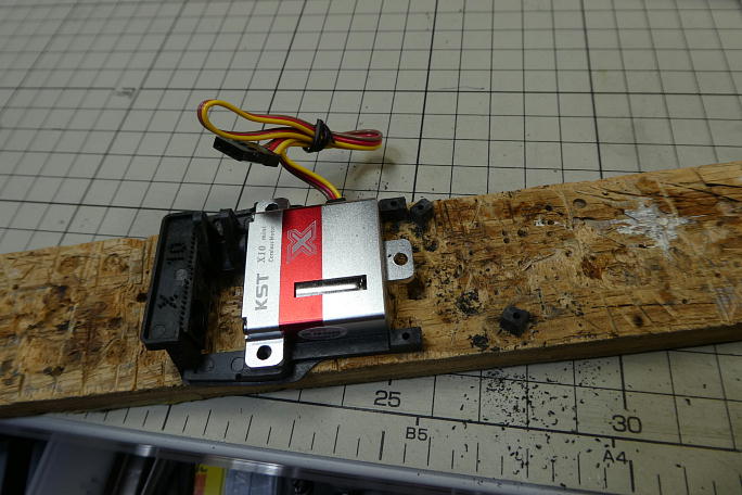 ![]() バリだらけのIDSフレームを成型します。 ![]() ベアリングの入るシャフトもそのままではペアリングが壊れそうなくらい挿入が固いので、軸部分を削って無理なく ベアリングが入る様にします。 ![]() 3本目の取り付けねじは使用しませんが、接着面積をより多く確保するため、フレームからネジ穴1本分のみ カットしました。 ![]() サーボ取り付けはポジドライブなので、専用ドライバーで締め付けます。 一度取り外す事を考え、何度か「締め」「緩め」 を繰り返し、外す時に主翼に負荷を掛けないようにします。 ![]() フラップ用のサーボホーンには大きい方から3番目を使用します。 このサイズですと、無加工で主翼下面から 出っ張りません。 |