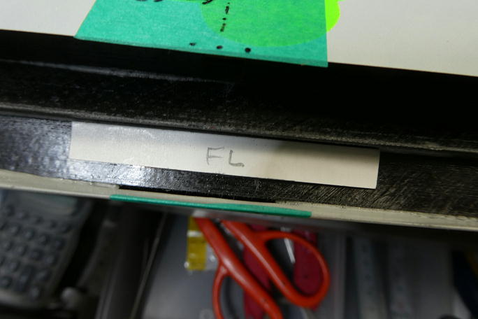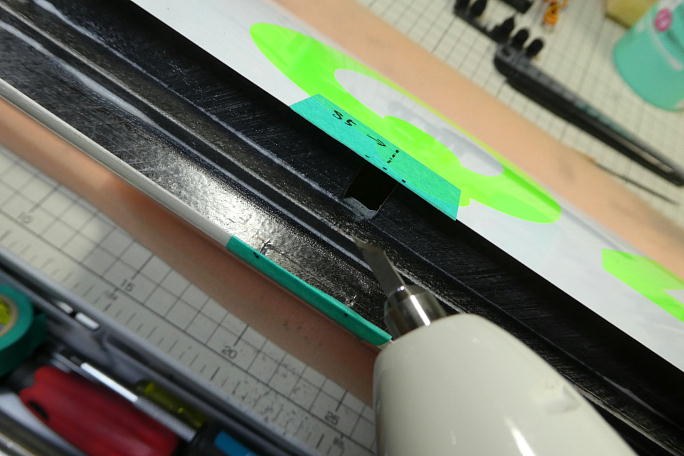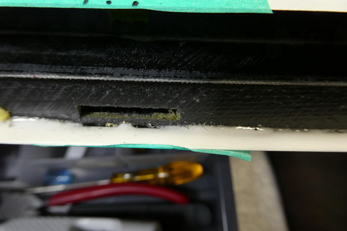 ![]() 分割されているIDSホーンをロッドと組んだ状態で低粘度瞬間接着剤で接着、組み立てます。 ![]() フラップスキン下面から4ミリになるように作ったテンプレートでフラップホーン用の切り欠き位置をマーキングします。 ![]() 超音波カッターでフラップの前縁材を切り開き、IDSホーンがスムーズに入る様に内部を削っておきます。 隙間埋めのマイクロバルーンエポキシが内部に垂れていたりします。 |