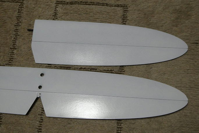 体重測定です。 胴体は三分割で、モーター、バッテリーを搭載するノーズ部、主翼を支えるセンター部、尾翼用サーボを 搭載するテール部からなります。 三分割で重ね部分もたっぷり取ってありますが、Explorer BFの胴体と5グラム程度しか差がありません。 ![]() Vテールの片側カンザシを含めてで24グラム、左右の重さは同じだったので、左右で48グラムです。 ![]() 下はF3J用の水平尾翼ですが、Vテールは片側で30ミリ長くなっています。 形状は全く一緒です。 ![]() 動翼にホーンもモールドされています。 |