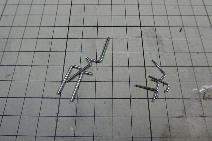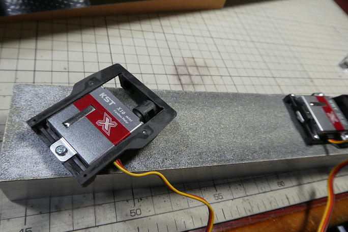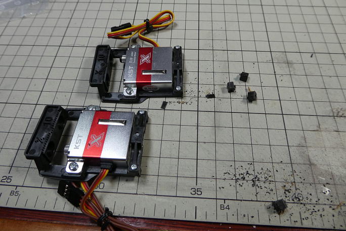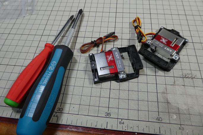 IDSの組み付けではピンを最低でも数回抜き差ししますが、付属のピンでは抜くときに掴む所が短くて作業が大変 なので、先端をL字に曲げたピンを製作しておきます。 ヒンジ側が1.5ミリ、サーボ側が1ミリです。 ![]() サーボベッドにサーボを組み付けます。 サーボベッドはX10、DS135のミニサイズとスタンダードサイズと共用なので、 ミニサイズの場合は脚の不要部分を切り落とします。 ![]() IDS付属の取り付けねじはポジドライブなので専用ドライバーを使います。 通常のドライバーでは掛かりが弱く、ネジを なめてしまいます。 |