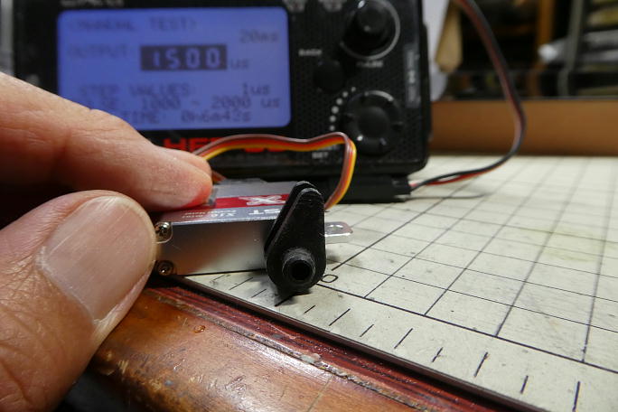 フラップサーボ用には主翼に収まる最大のサーボホーンを選びました。 一番大きな物から二番目のホーンがギリギリ 入りますので、このホーンを使用します。 ![]() バリだらけなので綺麗にバリは取り除いておきます。 また、支持用のベアリングが入らないので、軸部分を少し削って 合わせます。 ![]() ![]() ホーンとロッドの段差があり、削る余地があったのでホーンを削りツライチ状態にします。 ![]() この機体の送信機がJRなので、1500μsでニュートラルを出し、1セレーション分オフセットしてホーンを取り付けます。 ホーンはとても渋いのですが、ホーンを少し温める事で楽に入れる事が出来ます。 ![]() サーボを組み付けた状態で、サンディングボードで接着面の平面を出します。 この製品は樹脂のヒケが大きいので、 平面出しは重要です。 |