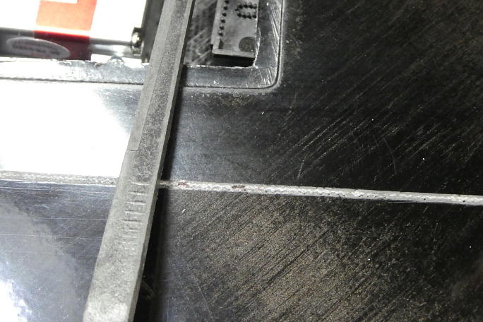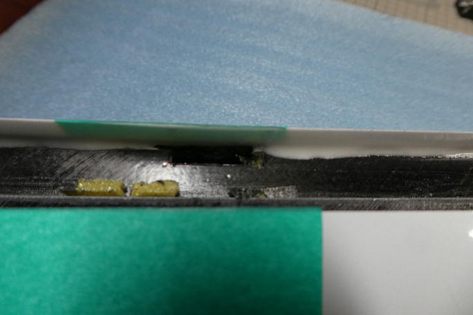 ![]() ホーンを差し込む位置をマーキングします。 エルロンのスキン直下からホーンの厚み分切り取ります。 ![]() 超音波カッターで切り開き、ヤスリでホーンが差し込めるように加工します。 内部にマイクロバルーン入りの樹脂が 垂れていたりします。 |
