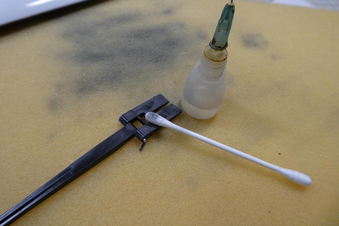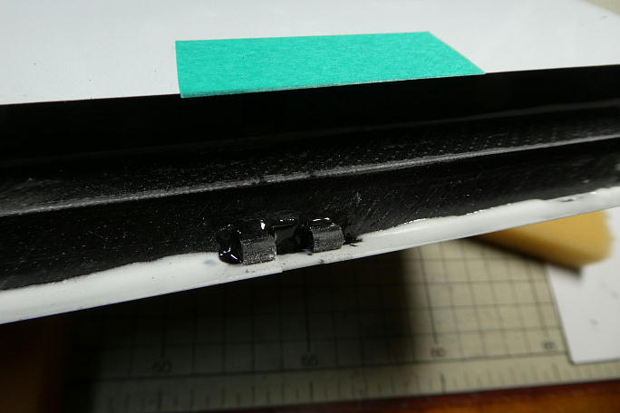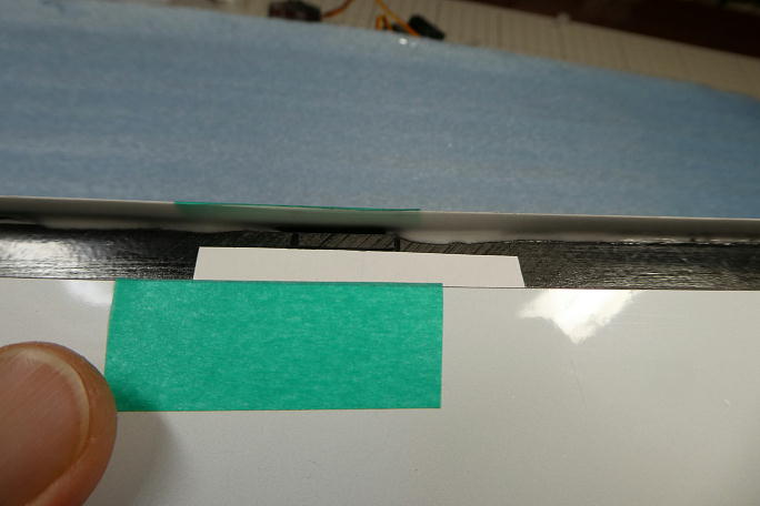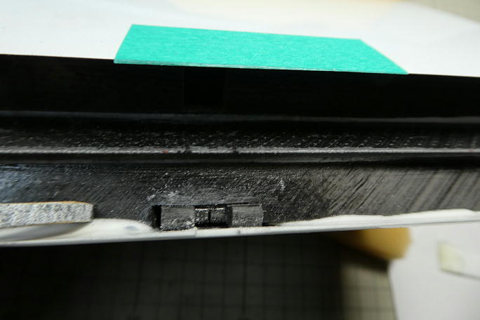 ![]() 接着は瞬間接着剤で行いますので、接着前にホーンの接着面を硬化促進剤で良く拭いておきます。 この時には 薬剤の持続時間が比較的長いロックタイトの712を使用します。 ![]() 左右の振れ、捻れを確認して高粘度瞬間接着剤を流し込み、速効で硬化促進剤を滴下します。 この時には白化 が無いボブスミスの硬化促進剤を使用します。 ![]() アップ側でロッドと干渉するギャップシールを3ミリ程削り込んでいます。 ![]() フラップのブレーキ動作を確認してみます。 充分な動作角が取れているので、サーボ側のホーンとオフセットも良好 なようです。 また、各所への干渉も見られませんでした。 ![]() エポキシで補強をするために、ホーン周囲をサンディングして荒らしておきます。 バルサやヒノキ材にサンドペーパー を貼り付けた物でザッと擦っておきます。 ![]() ホーンとその周辺の隙間にカーボンパウダー入り5分エポキシを盛って補強とします。 フラップホーンは組み合わせた 時に中央部に隙間が出来ますので、その間にもエポキシを流し込んでおきます。 |