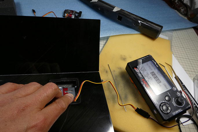フラップサーボの搭載位置を粗方決めます。 この機体にはホーン取り付け部分のハードポイントが確認出来なかった ので、フラップサーボはサーボ取り付けの3本のネジがサーボホール内に収まる様な位置にサーボを取り付けることに しました。 位置が決まったら、ヒンジにサインペンでロッドの位置をマーキングします。 光を当てると反対側から確認することが 出来ます。 ![]() マーキングしたロッド位置を参考に後縁スパーにロッドの貫通穴を加工します。 この手の機体では後縁スパーは翼型 保持程度にしか考えられていないので、思い切って大きく加工しておきます。 ギリギリ小さく開けて、現物合わせで 少しずつ広げても、このくらいの穴になってしまうのです。 |