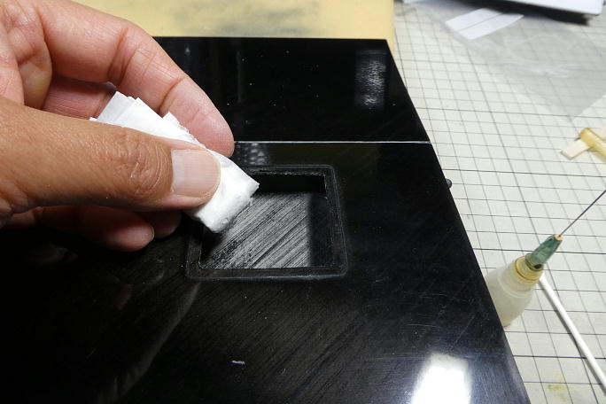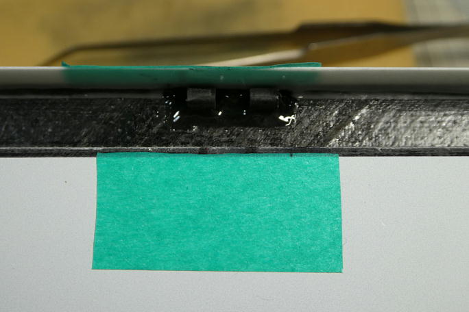 サーボホールの接着面をサンドペーパーで良くサンディングしておきます。 樹脂硬化時に出来たヒケやピンホール でかなりザラザラしていますので、サーボベースとの密着をよくするための工程です。 ![]() サンディング後のサーボホールを硬化促進剤で拭いておきます。 清掃と接着を確実にするためです。 硬化促進剤はロックタイトの712です。 ![]() サーボベース側の接着面も硬化促進剤で拭いておきます。 綿棒に付いた汚れが取れただけでも効果があります。 ![]() フラップのニュートラルが判りにくいので、胴体のフィレットに合わせる事でフラップのニュートラルとします。 動翼の ニュートラルとサーボのニュートラル(1500μs+160μs)を合わせて、サーボベースの四隅のみ中粘度瞬間接着剤 を垂らして、直ぐに硬化促進剤で硬化させます。 時間をおくと、瞬間接着剤がロハセルにまで染みこみ、表皮にヒケが出てしまいます。 硬化促進剤はボブスミスを使用します。 ![]() サーボを一度取り外し、サーボベースの全周に中粘度瞬間接着剤を流し、直ぐに硬化促進剤で硬化させます。 瞬間接着剤は大量に塗布しないで、サーボベースと主翼間に毛細管現象で吸い込まれる程度で留めます。 その程度で充分な接着力があります。 瞬間接着剤を流したら直ぐに硬化促進剤で硬化させます。 硬化促進剤はボブスミスを使用します。 |