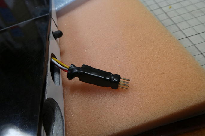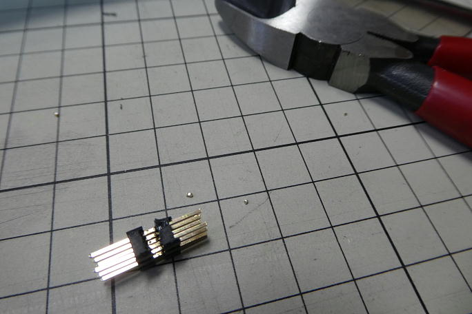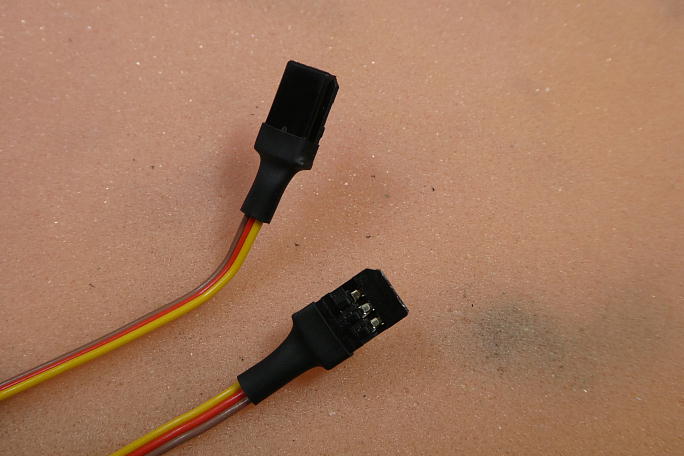 ![]() キット付属の2列ピンヘッダをハンダ付けした物。 ピンが長すぎてコネクタにピンが収まらないので切り詰めました。 ![]() フラップとエルロンのコネクタをまとめてピンヘッダーに刺し、キット付属のシュリンクチューブを掛けて完成です。 |
