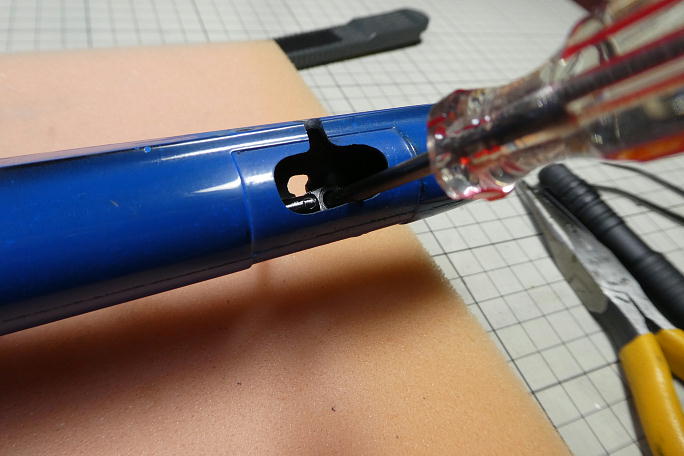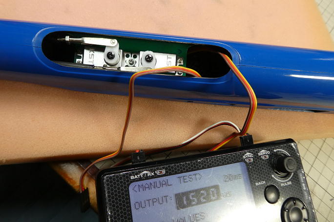 ![]() リンケージロッドの片側にはメーカーで2ミリのボルトが取り付けられていて、そこに樹脂製のボールエンドを取り付ける 方式です。 ですが、胴枠に開けられたガイド穴のサイズの関係で、ボールエンドを付けたままでロッドを通すことが出来ません。 なので、ホールエンドは胴体内でホールエンドとリンケージロッドを組み合わせる必要があります。 ボールエンドの穴にドライバーを通して固定し、ロッドをメカハッチから回してボールエンドとリンケージロッドをドッキング させます。 リンケージロッドを胴体から引き抜くと、再度胴体に挿入するのが至難の業です。 モーターマウントを取り付ける前 なら、ノーズの開口部から覗きながら胴枠のガイド穴を通すと比較的楽です。 ![]() リンケージのアジャスターでの調整幅を5ミリとしてリンケージロッドをリューターの切削砥石でカットします。 ![]() 簡易ニユートラル出しツールでVテールのニュートラルを出します。 ![]() 1520μsのニュートラルで、アジャスターネジとリンケージロッドを低粘度瞬間接着剤で接着します。 |