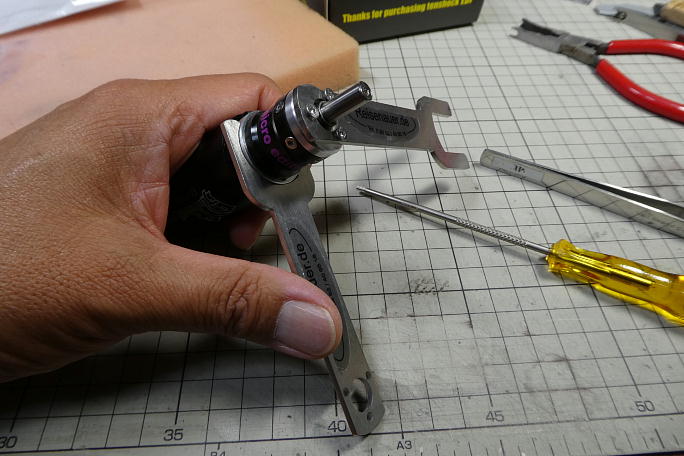 ![]() モーターとギヤユニットがバラバラの状態で届きました。 ![]() プラネタギヤに付属のグリスを少量注入します。 グリスはシリンジに入れられていますが、口の部分が固まっていて、 力を入れると大量のグリスが出て来てしまいます。 最初の一押しは廃棄した方が良いようです。 ![]() ギヤユニットとモーターはねじ込みで取り付けますが、画像の専用工具があると楽に締め付けられます。 薄口スパナでも押さえられますが、ギヤユニットは手の握力に依存することになります。 ![]() モーターとギヤユニットが組み上がりました。 |