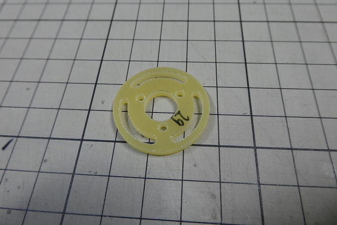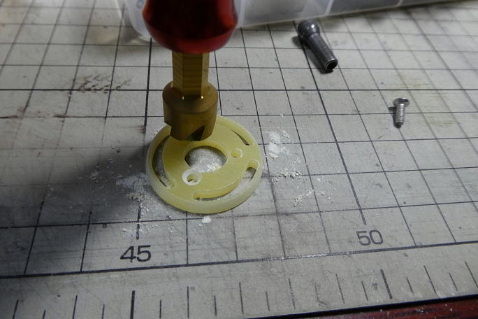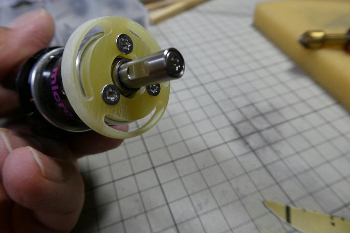 ![]() 3ミリFRP板のモーターマウントが付属します。 マウントには、ギヤユニットのミクロエディション対応の3つ穴が加工されて います。 ![]() 取り付けねじは皿頭なので、取り付けネジ部に皿加工を施します。 ![]() 胴体の先端、モーターマウントを取り付ける辺りの内部はアールが付いているので、モーターマウントもそれに合わせて角を を落とします。 何回か削る−−合わせるを繰り返し、妥協点を見付けます。 ![]() モーターとモーターマウントを仮組みしてみました。 |