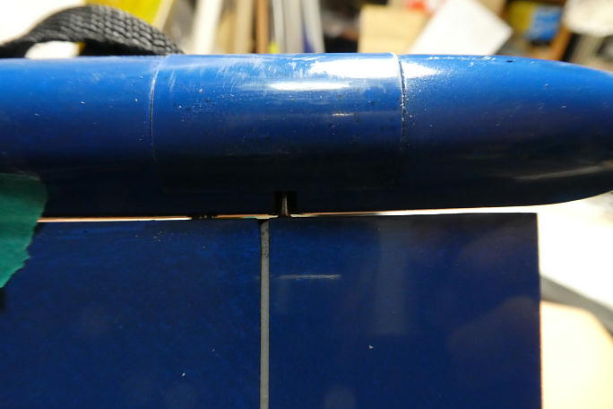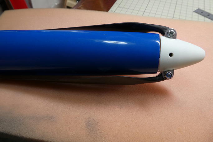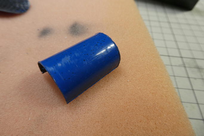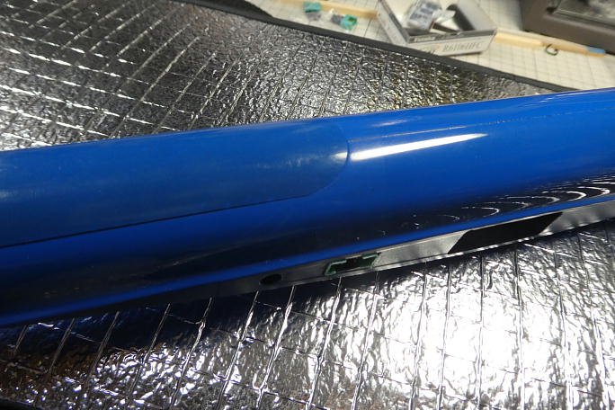 ![]() Vテールのホーン回りのカバーです。 切りっぱなしなので、このままでは取り付けられません。 ![]() 少しずつ削って胴体に合わせます。 ![]() 胴体にピッタリ合いました。 セロテープで固定します。 |