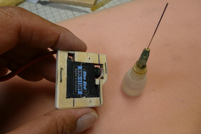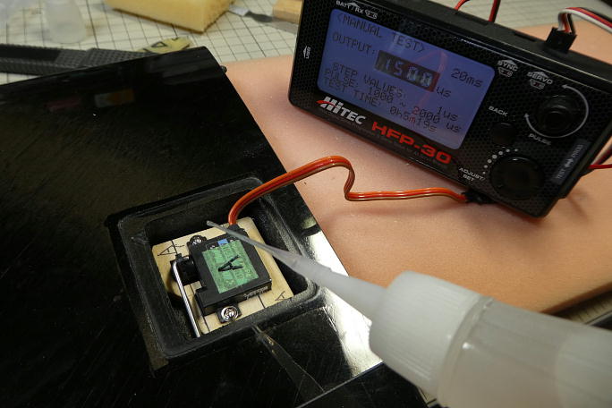 ![]() サーボベッドを接着する部分に硬化促進剤で拭いておきます。 清掃と接着促進が目的です。 効果時間が長いロックタイトの712を使用します。 ![]() サーボベッド側にもロックタイトの712を染みこませておきます。 ![]() サーボとエルロンのニュートラルを合わせて、サーボベッドとサーボホールの隙間に中粘度瞬間接着剤を流して サーボベッドを接着します。 ロハセルでは無いので慌てる必要はありませんが、早い内に硬化促進剤で硬化させます。 白化の少ないボブスミスの硬化促進剤を使用します。 ![]() 歪み無く工作が出来ました。 |