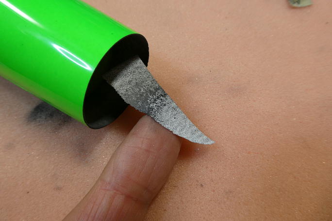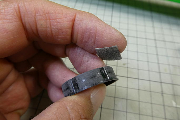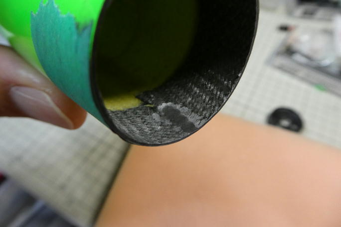 ![]() モーターマウント取り付け部はカーボンテープで補強がしてありますが、テープの重ね目が盛り上がってしまっています。 ![]() 重ね目を削り落として平滑にしておきます。 ![]() 接着の準備として接着部をサンディングしておきます。 |
