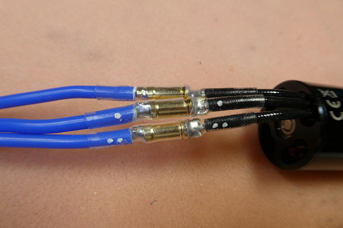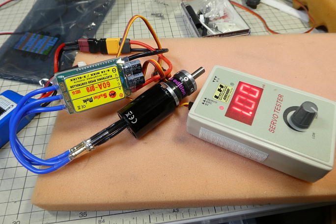 サーボテスターを使ってモーターの回転方向を確認しておきます。 ![]() モーターとESCのコードには合いマークを入れておきます。 |