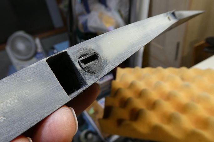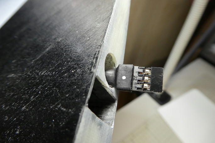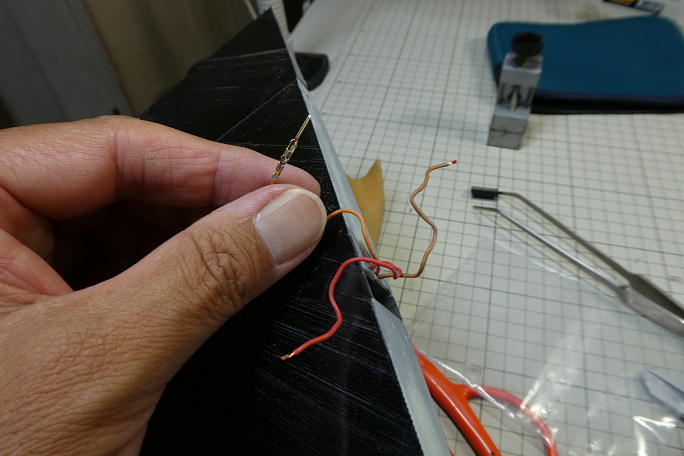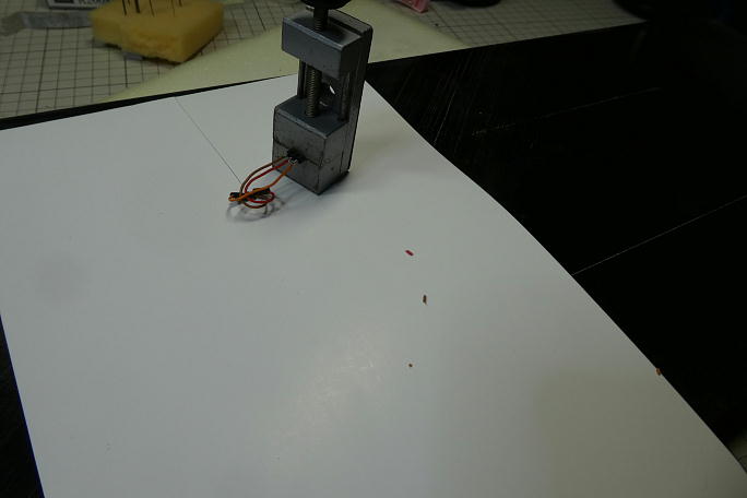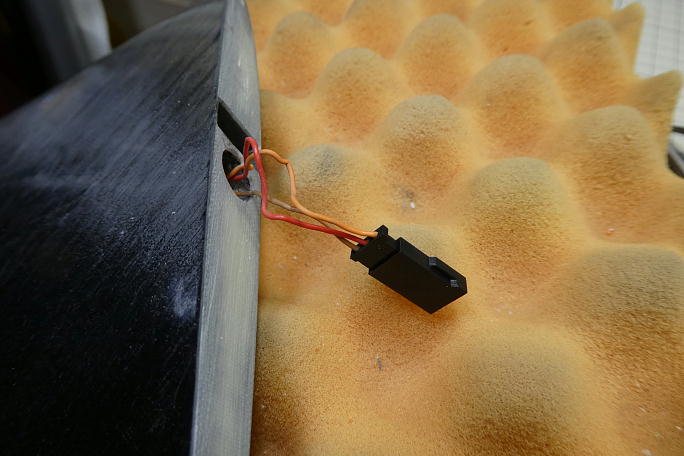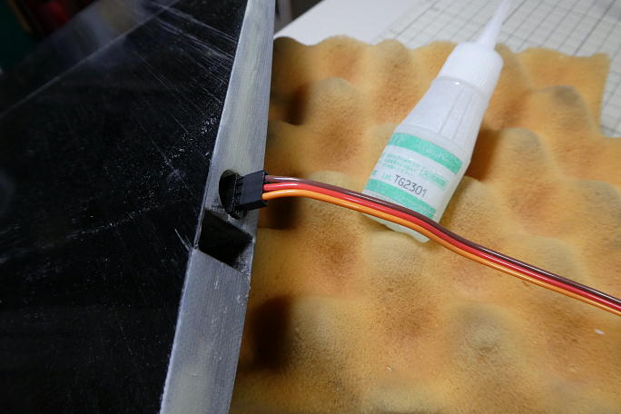 ![]() フラップサーボ用の連結ピンヘッダを取り付けます。 コードが埋設されているので、主翼上でのハンダ付け作業と なります。 万が一ハンダをポトッと落としでもしたら大惨事なので、切れ込みを入れたボール紙で養生をしてからの作業になります。 ![]() 取り付けの終わったピンヘッダーです。 ![]() 中央翼のコネクタハウジングを納める部分はロハセルで埋まっていたので、ハウジングが納められるスペースを削り、 彫り込みます。 ![]() コネクタを取り付けます。 こちらもコードが埋設されているので、出来るだけコードを引っ張りだして作業環境を整えます。 ![]() コネクタの取り付けが完了しました。 ![]() 瞬間接着剤での接着の準備として、表面をサンディングして足付けをします。 その後、硬化促進剤で拭いておきます。 硬化促進剤には持続時間の長いロックタイトの712を使用します。 ![]() カンザシの角度を参考に、角度を付けて中粘度瞬間接着剤でコネクタハウジングを接着します。 ![]() コネクタハウジングの上下にぽっかり隙間が出来ているので、カーボン素材の端材を使って蓋をする事にします。 ![]() 蓋の終わった翼端部分です。 |