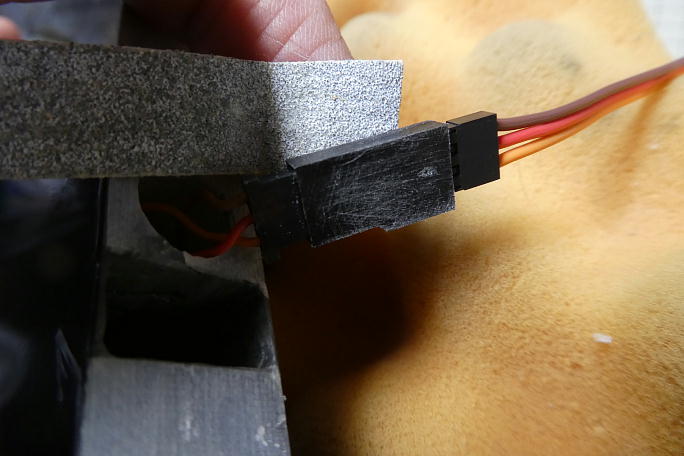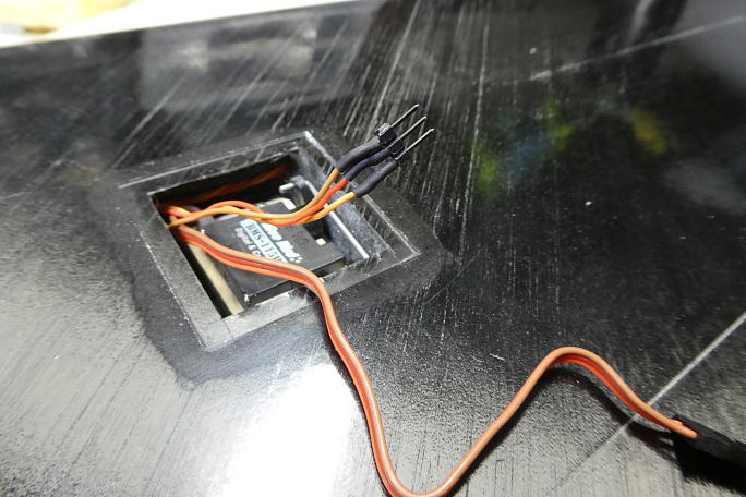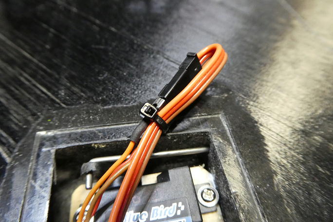 ![]() 余ったコードを引っ張ってもコネクタが抜けない方向で束ねて、タイラップで縛っておきます。 ![]() サーボカバーをカバーフイルムを10ミリ幅に切った物で取り付けます。 |
