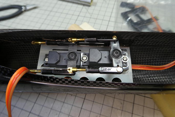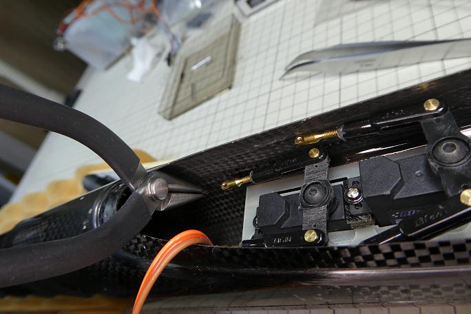 ![]() 水平尾翼を取り付けて、簡易ニュートラルツールでニュートラルを出します。 ![]() サーボのニュートラルと合わせ、ワイヤーにテンションを掛けてミニやっとこでスリーブをカシメます。 カシメた所に 低粘度瞬間接着剤を流して固定します。 ![]() 完成したエレベータ、ラダーリンケージです。 |