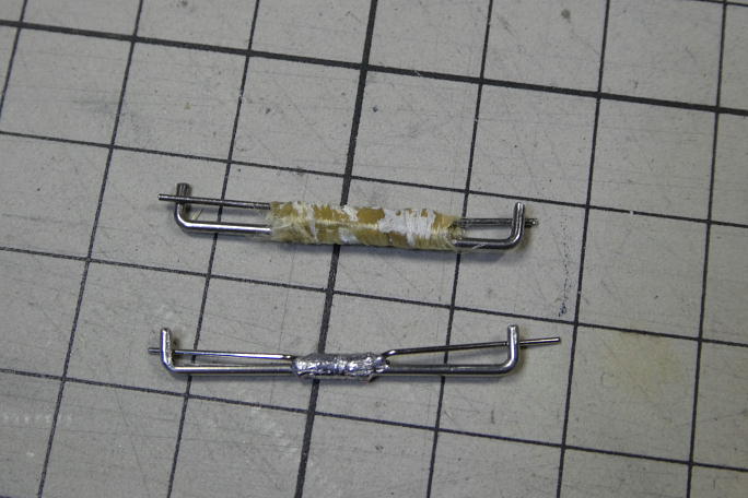 ![]() エレベーターリンケージがゴリゴリして動きが悪いと思ったら、キット付属のロッドが太くて水平尾翼パイロン内壁に干渉 していました。 ![]() シュリンクチューブを剥いでみました。 糸で巻いてエポキシで固めてあります。 抜け止めスプリングにしているロッドが固くて全く開きません。 これでは水平尾翼のホーンが通りません。 ![]() ロッドを作り直しました。 バネ部分を長くして、組み立て時のエレベーターリンケージをし易くしました。 |