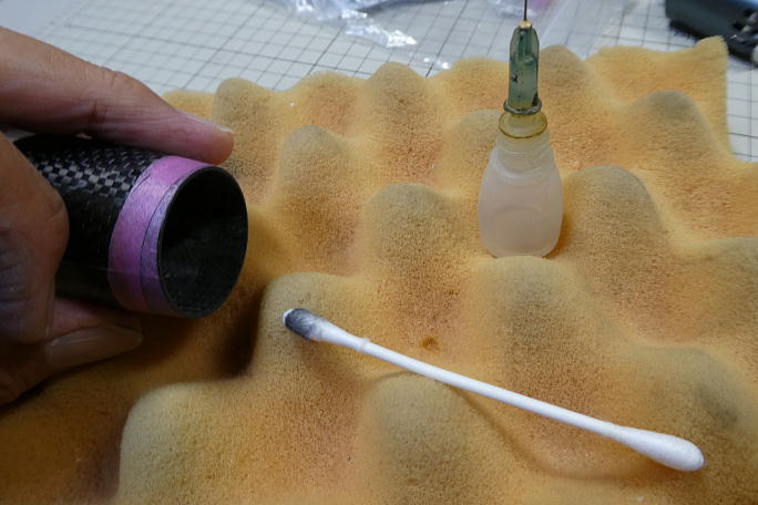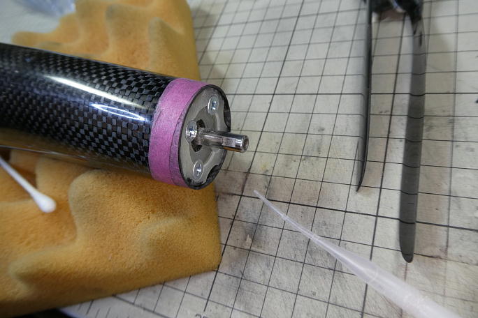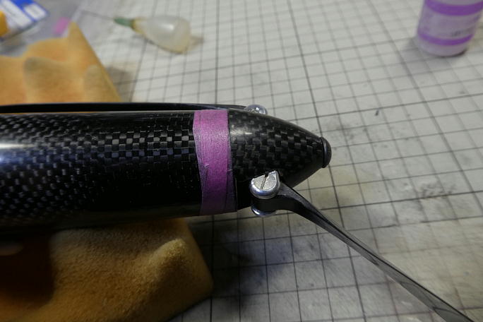 ![]() 胴体のノーズ部は切りっぱなしなので、ユーザーで切り取ってスピンナーに合わせる必要があります。 パーテーションラインと直角になるようにテンプレートを合わせて、切り取るラインをケガキます。 ![]() ![]() ケガキ線に沿ってマスキングテープを貼り、リューターの切断砥石でカットします。 ![]() モーターを仮組して、マウントに黒くカーボンが付いて所を削って微調整をします。 ![]() ![]() モーターマウントと胴体の接着部を硬化促進剤で拭いておきます。 硬化促進剤には持続時間の長いロックタイトの 712を使用します。 ![]() 角度を合わせるため、スピンナーを取り付けて位置合わせをします。 ![]() スピンナーをそっと外して、低粘度瞬間接着剤の点付けで仮接着をします。 ![]() モーターを外して、中粘度瞬間接着剤で本接着をします。 |