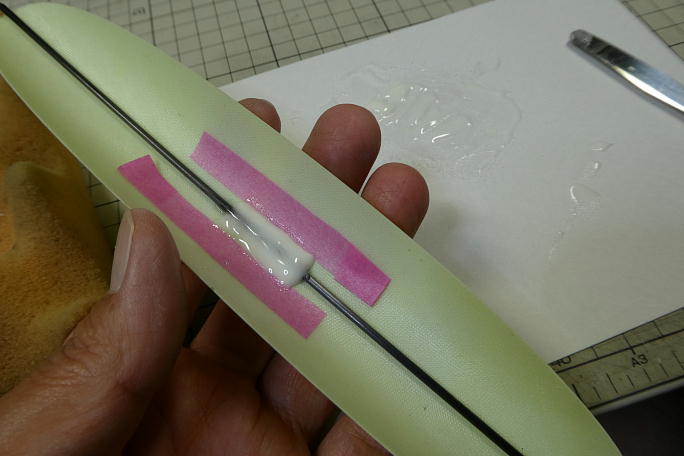 ![]() キャノピーラッチには2ミリカーボンロッドを使用します。 ロッドを接着する部分をサンディングして足付けをしておきます。 ![]() キャノピー裏面のカーボンロッド接着部もサンディングして足付けをしておきます。 ![]() キャノピーとカーボンロッドの接着部を硬化促進剤で拭いておきます。 ロックタイトの712を使用します。 ![]() キャノピーにカーボンロッドを中粘度瞬間接着剤で接着します。 ![]() 瞬間接着剤の硬化後に、カーボンロッドの補強として、マイクロバルーン入り5分エポキシを盛ります。 盛る周辺にマスキングテープを貼って、綺麗な「盛り」を目指します。 ![]() マイクロバルーン入り5分エポキシを盛って、ヘラである程度均しておきます。 均せたら、直ぐにマスキングテープを 剥がして、硬化を待ちます。 ![]() 盛ったマイクロバルーン入り5分エポキシが綺麗に流れて自然な形になりました。 ![]() |
