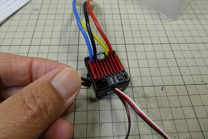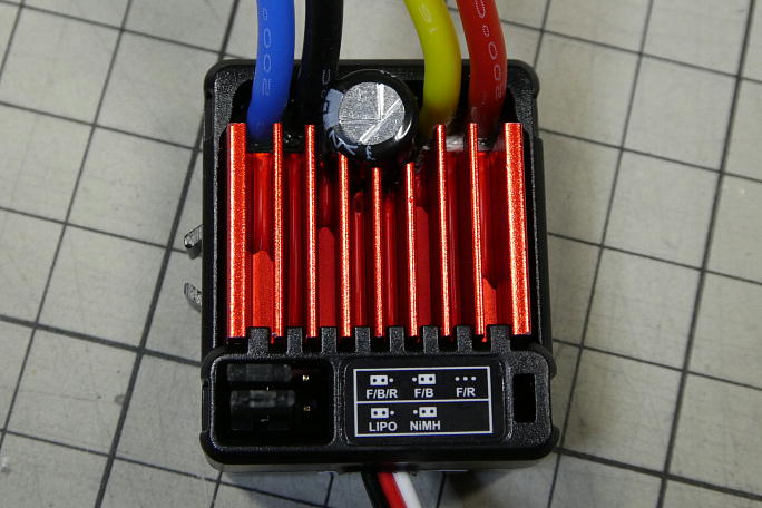 ![]() ESCは安価なタイプです。 細かな設定は無く、二つのジャンパーピンだけで設定を行います。 ![]() 動作モードは、前進/ブレーキ/バックモード、電源はLi−Poとします。 |