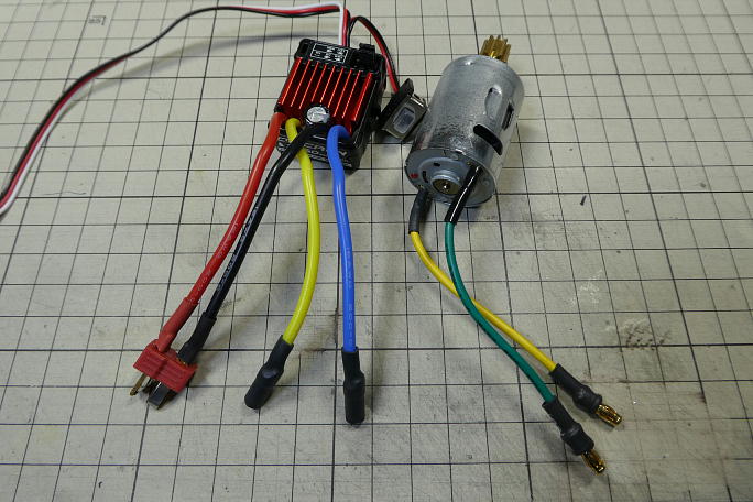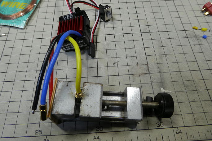 ![]() 電源はタミヤコネクター、モーター出力はギボシ端子となっています。 私達空物ユーザーには馴染みの無いパーツ で性能も今ひとつな物です。 ここは一つ、馴染みのあるパーツと取り替える事にします。 ![]() ![]() バッテリー向けにはディーンコネクタ、モーター向けには3.5ミリゴールドコネクターをハンダ付けしました。 |
