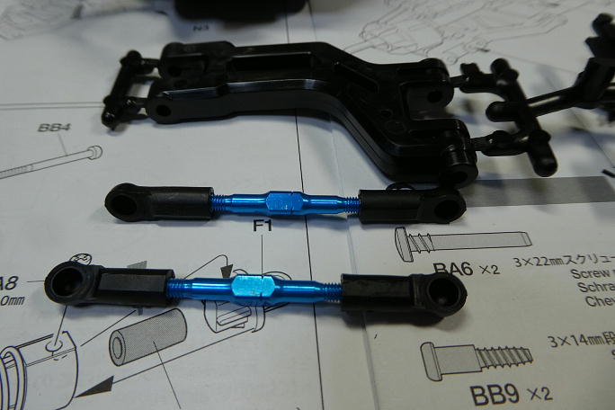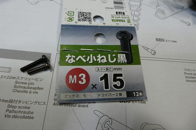 ![]() リアサスもフロントサスと同様にアッパーアームをターンバックルに置き換えます。 幅をノーマルのアッパーアームの幅 に合わせて調整しておきます。 ![]() ターンバックルセットに入っているはずのネジが一本、サイズ違いでした。 手持ちにも同サイズのネジが無かったので、 ホームセンターで調達しました。 ![]() リアサス部の組み立て完了です。 |