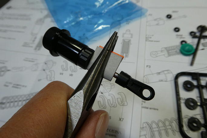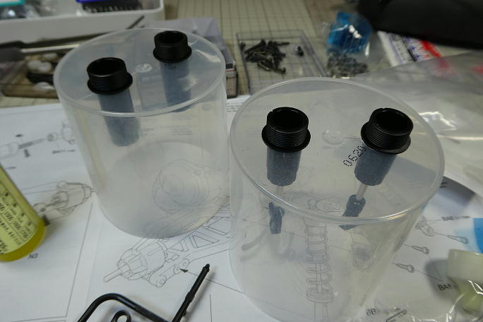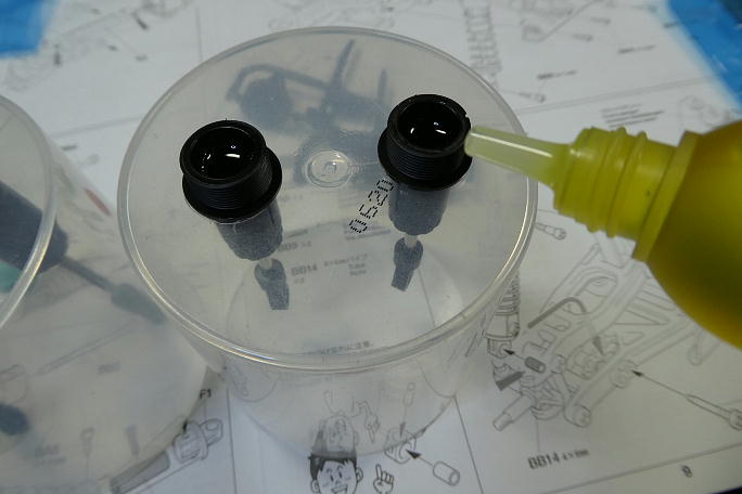 ![]() ダンパーを組み立てます。 キットのダンパーはゴムスリーブとグリスの粘度でダンパー効果を得るフリクションダンパー ですが、オプションのCVAオイルダンパーを組み込みます。 ![]() ターンパーケースにピストンを通し、ダンパーエンドをピストンシャフトにねじ込みます。 シャフトにキズを付けないように ボール紙で保護をしてペンチで挟み、ダンパーエンドを回します。 ![]() 綿棒のケースで作ったダンパースタンドを使ってダンパーオイルを入れていきます。 ![]() 気温が低くて、あわが消えにくそうだったので、、オイルを温めてから使用します。 ![]() ダンパーにオイルを静かに注ぎ、ピストンを静かに上下させて空気を抜きます。 泡が消えてから規定量までオイルを 継ぎ足します。 昔は何本も組んでいた事を思い出しました。 ![]() キャップを閉めて完成です。 ![]() 取説に従い、ダンパーセットの物では無くキット付属のスプリングを組み込みます。 |