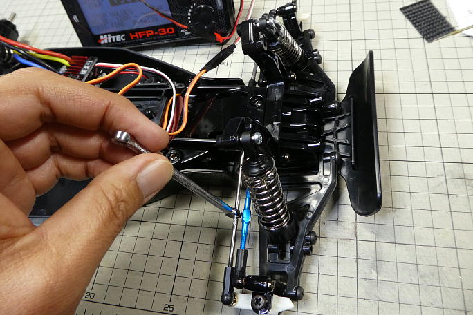![]() サーボのニュートラルを出して、デスクマットの方眼を使ってステアリングのニュートラルを出します。 この段階では、左右のシャフトが一直線になるように調整しておきます。 ![]() 受信機にステアリングサーボ、ESCを接続し、ESCに電源を接続します。 ステアリングのリバース、スロットルの リバースを確認しておきます。 |