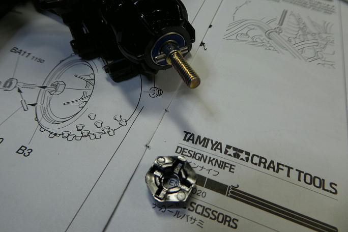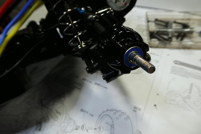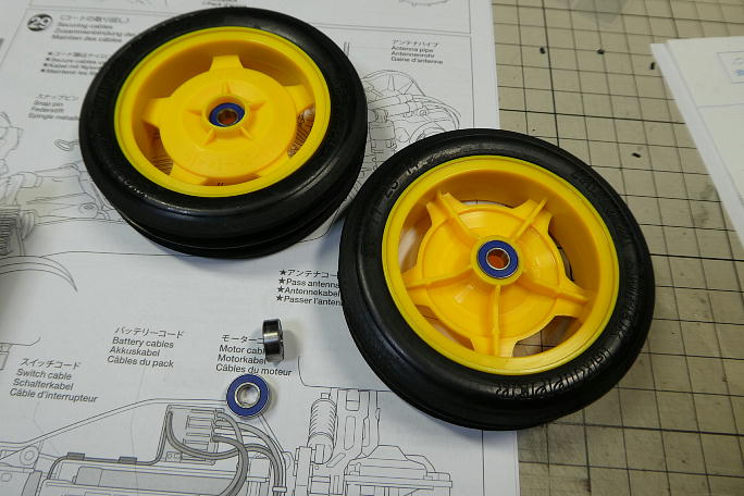 ![]() リアハブの外側にラバーシールドベアリングを挿入します。 ![]() シャフトに樹脂製の六角ハブを取り付けます。 ![]() フロントはホイールにベアリングを挿入する仕様で、裏表から一個ずつのラバーシールドベアリングを挿入します。 ![]() タイヤを取り付けてシャーシ部分の完成です。 |