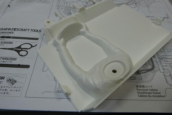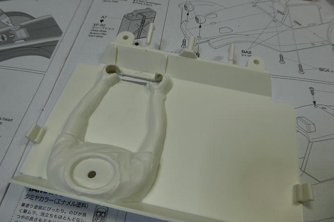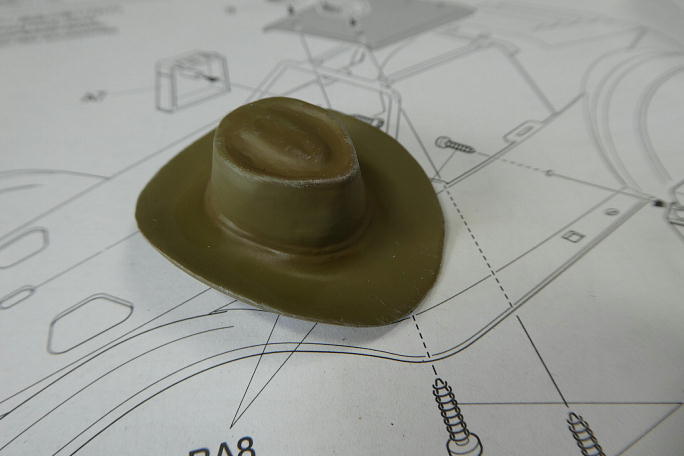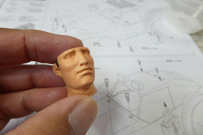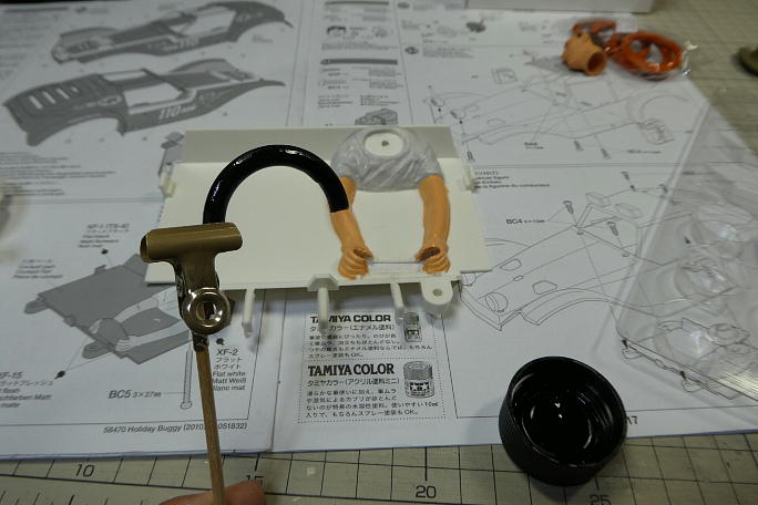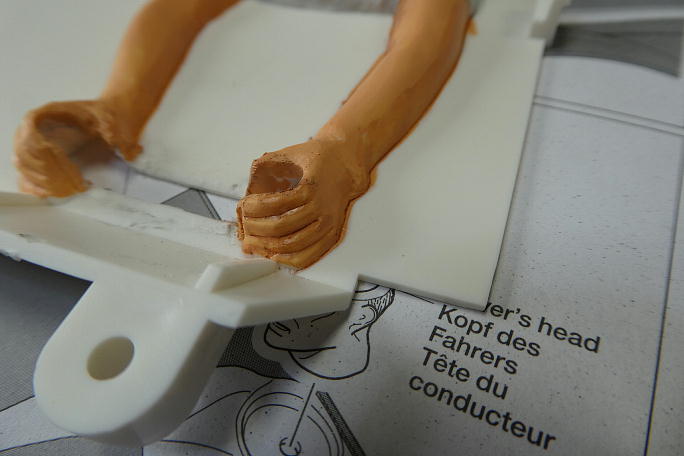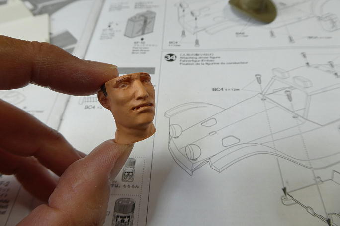 ![]() ドライバーですが、ハンドルがデフォルメされすぎていて、まるでお盆を持っているかのようです。 このままでは いけないと思い、手を入れることにしました。 ![]() ハンドルを持たせる為に、お盆を切り離して周囲を整形します。 ![]() この様な木製のリングを手芸店で見付けました。 これをハンドルとします。 40ミリ径、太さ4ミリのリングです。 ![]() 仮組してみました。 これならメーターパネルも見えます。 ![]() 腕と胴体を筆塗り塗装します。 胴体はライトグレーでTシャツを塗り、ホワイトでハイライトを入れています。 ![]() ![]() 塗装済みの帽子は、ブラウンのエナメルで汚して、グレーのドライブラシですり切れ感を出して見ました。 ![]() ![]() 顔部分も塗装済みですがのっぺらぼうです。 ブラウンで墨入れをし、エナメルホワイトで白目を入れました。 黒目部分は一発筆入れでブラウンを入れています。 ![]() 腕もブラウンでグラデーションを入れています。 ![]() 身体回りをフラットブラックを筆塗りで塗り分けます。 ![]() メーターパネルのステッカーを貼りました。 ハンドルの隙間から見えています。 ![]() 胴体と首上を合体させて完成です。 |