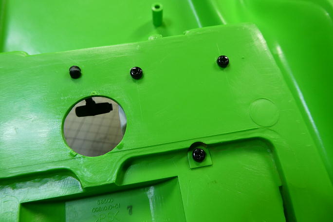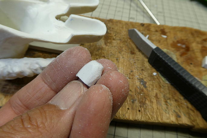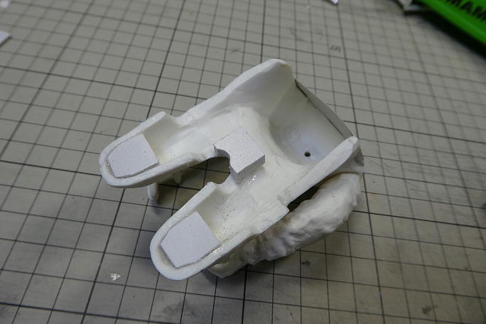 ![]() ボディーにはドライバー取り付け用の穴が開けられています。 ドライバーをボディーに取り付ける為に、ドライバーの 膝裏に取り付け用のねじ受けを設けます。 発泡塩ビを膝裏の形に削って取り付けます。 ![]() 両膝裏と股間にベースが出来ました。 この3本のネジでドライバーが固定されます。 |