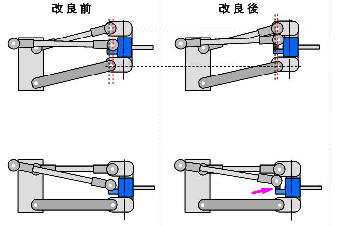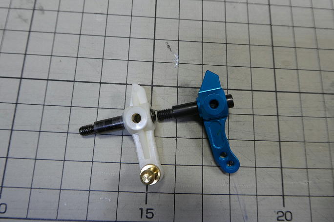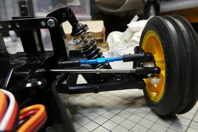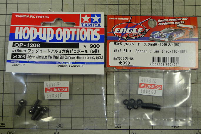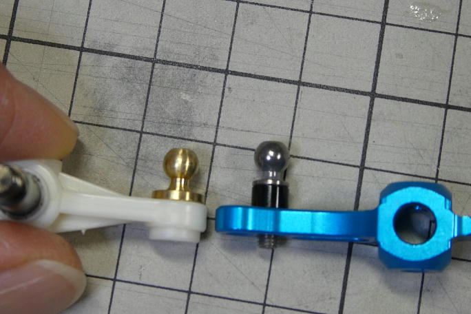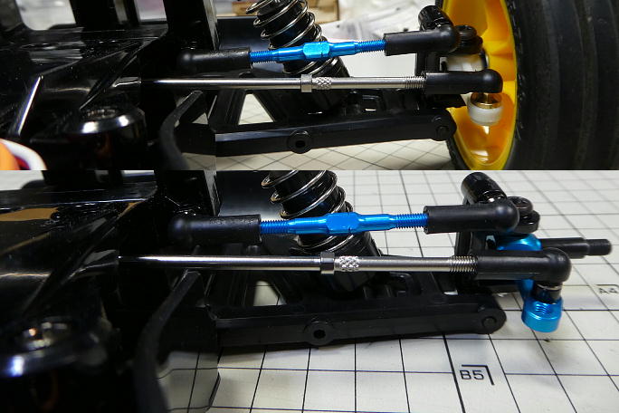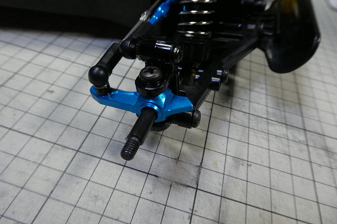 ![]() ホリデーバギーに使われているDT−02シャーシは、横積みサーボのサーボセイバーから直接タイロッドがナックルアーム に伸びている形状です。 そのため、サスペンションアームとタイロッドに大きな角度差が付いています。 ![]() それにより、バンプインと呼ばれる、サスペンションが縮んだ時に両タイヤが内側に向くトーインが付く特性があります。 実車などは良く使われる物で、ブレーキを掛けてフロントサスペションが縮んだ時にトーインが付き、直進安定性を 保たせたりしています。 DT−02シャーシでは、ジャンプ後の着地を安定させる狙いで設定されているようですが、トーインの角度が強く、 逆に暴れてしまうなどの弊害もあります。 バンプインの量を減らす方法として、ナックルアームのタイロッドの取り付け位置を上に上げて、サスペンションアーム との角度差を減らす等がありますが、標準の樹脂製ナックルアームでは、強度の面で不安があります。 ![]() と言う事で、アルミ製ナックルアームの導入です。 ![]() 左が標準の樹脂製ナックルアームで、右がアルミ製のナックルアームです。 ![]() 同時に、足の長いピロボールとかさ上げ用のスペーサーも購入しました。 ![]() 3ミリのスペーサーを入れて、ピロボールをネジロック剤を使って取り付けます。 ![]() これだけ高くなります。 ![]() シャーシに組み付けました。 ナックルアームとの取り付け位置が高くなった分、サーボセイバーとの距離が短くなるので タイロッド長の調節も行います。 ![]() 上が変更前、下が変更後です。 見た目は僅かですが、角度差が縮まっています。 ![]() フルボトムさせた状態で、僅かにトーインが付く程度になりました。 |