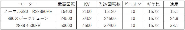 ![]() ノーマルモーターで物足りなくなり、スポーツチューンモーターに換装してある「きむらクラフトバギー」ですが、 更に高速域での伸びが欲しくなり、モーターの交換をして見ることにしました。 王道は380モーターから540モーターへ、更に540ブラシレスモーターと行くのてずが、ここは380サイズのモーター に拘ったチューンナップを推し進めることにしました。 540モーターはピニオンギヤが17Tからなのですが、380モーターでは10Tが標準です。 それを踏まえた 最高速度を調べてみました。 ノーマルモーターと現在のスポーツチューンモーターの差は最高速度で約10km/hです。 17Tのピニオンギヤを 取り付けた540ノーマルモーターと計算値ではほぼ同じですが、モーター単体の重さが100g軽く、前後の重量比 や車体重量で380モーター仕様にアドバンテージがあると考えています。 ![]() ![]() 事前に車体にワットメーターを車体に括り付けて、最高電流値を調べてみましたが、フルスロットルでの加速で10A ちょっとしか流れていません。 |