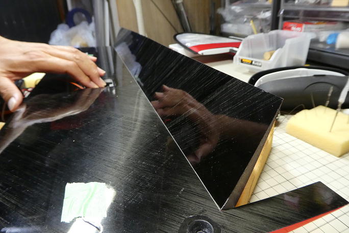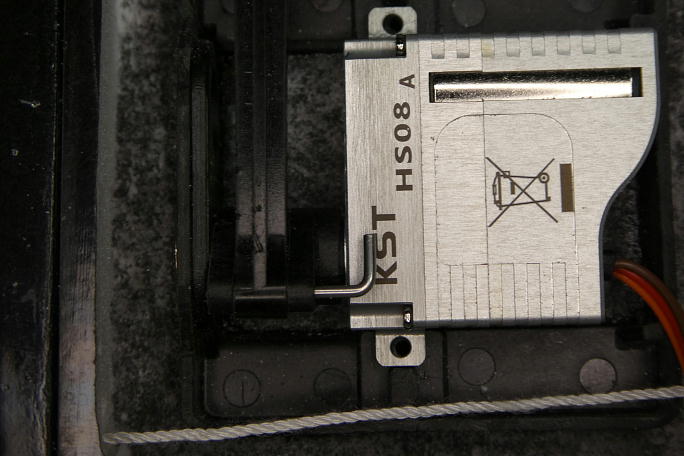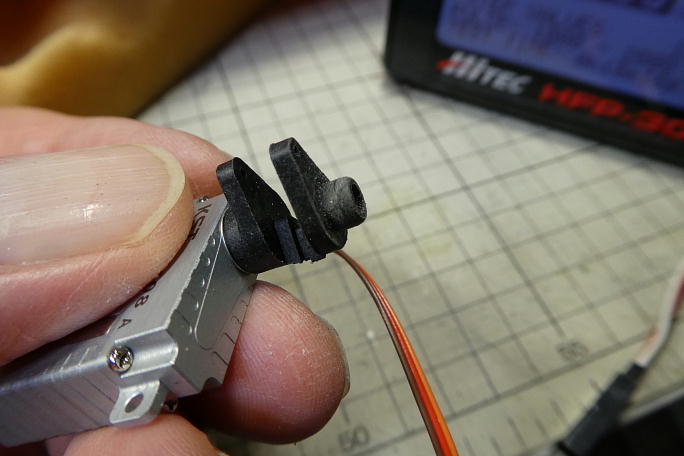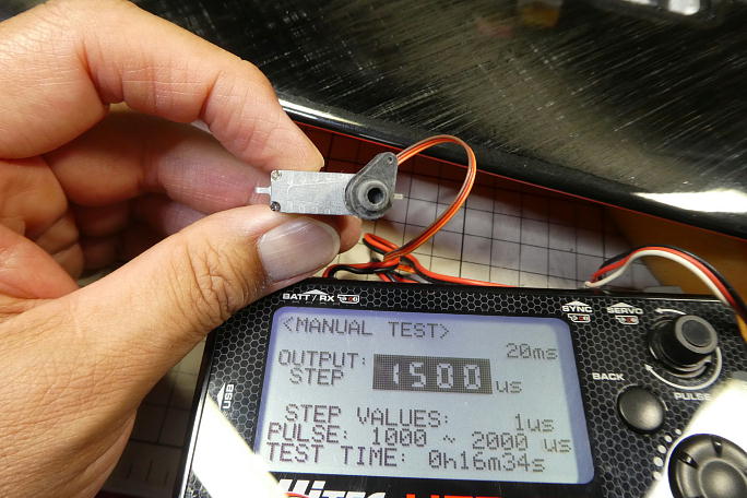 ![]() 仮組でフラップの舵面をニュートラルに持っていくと210μsのオフセットが必要になると出ましたので、予めホーンを 1スプライン分オフセットさせて、送信機でのオフセットの軽減を図ります。 ![]() IDSのベースがフォーム翼用で、サーボのサイズギリギリのため、スライドさせてのサーボ取り付けが出来ません。 せっかくのベアリング支持タイプですが、サーボを斜め上から押し込むためにベアリング支持部分の角を落とします。 ![]() 調整用のピンを使って仮組をします。 調整用のピンは1ミリのSUSピアノ線で作っています。 ![]() 動作確認をします。 |