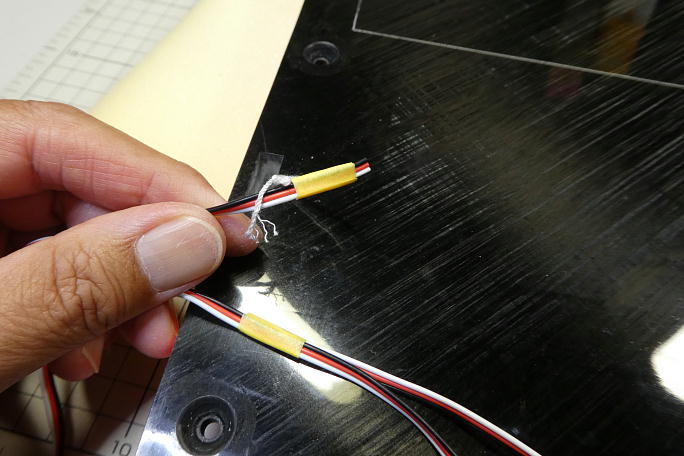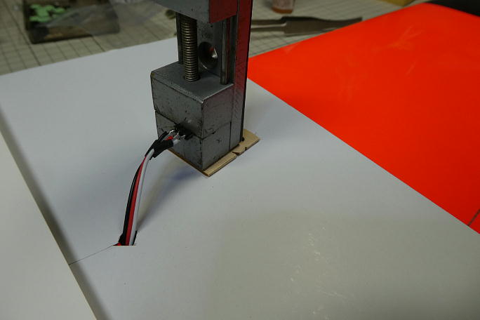 ![]() メス側のコネクタは中央翼のメーカー加工ホールに埋没させる事になりますので、接着部はサンディングして足付けをして おきます。 ![]() リードのたこ糸にコードをマスキングテープで仮止めして主翼内に通して行きます。 フラップサーボホールで一端取りだして、エルロン向けを再度主翼内に通して行きます。 ![]() フラップサーボ用のピンヘッダーを主翼上にてハンダ付けをします。 ボール紙で養生をして、不測の事態に備えます。 ![]() ![]() 胴体向けのメスMPXコネクタをホールに押し込んで、中粘度瞬間接着剤で接着します。 2ミリ程主翼下面から 飛び出します。 |