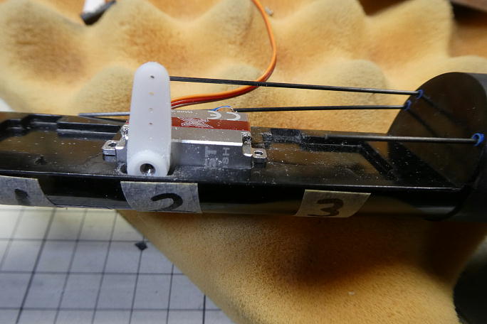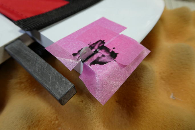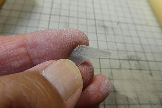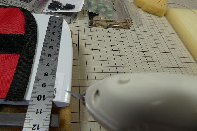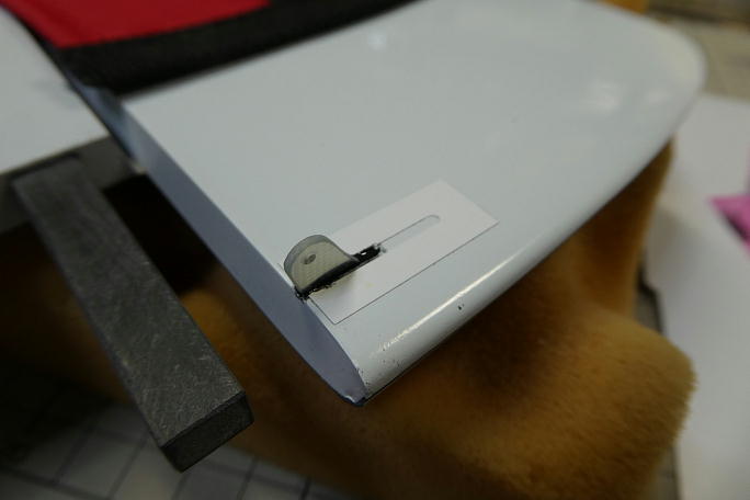 ![]() 1ミリFRP板からラダーホーンを切り出します。 底面からロッド穴までは、リンケージの取り出し位置から12ミリとして います。 ![]() ホーンの取り付け場所はメーカーが貼ってきたマーキングシールに従いました。 このシール、この時点では剥がせない 物と思っていましたが、わりと簡単に剥がれました。 超音波カッターで表面スキンを切り取り、中のロハセルを掻き出しておきます。 ![]() スキンが柔らかいので、当たって押し跡が付かないように角を丸め、表面をサンディングして足付けをしておきます。 ![]() カーボンパウダー入り5分エポキシを用意します。 ![]() マスキングをして、ラダーホーンスロットにカーボンパウダー入り5分エポキシを充填します。 内壁に良くこすりつけて おきます。 ![]() はみ出すカーボンパウダー入り5分エポキシを拭いつつ、ホーンを沈めます。 ホーンが沈められたら直ぐにマスキング テープを剥がしておきます。 ![]() ラダーホーンの取り付け完了です。 |