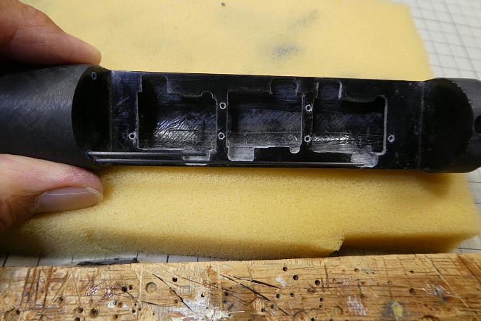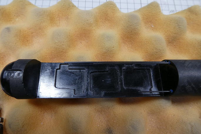 後部胴体にモールドされているサーボベッドです。 ![]() 使用するサーボを乗せてみましたが、このまま取り付けたのではサーボが当たってポッド部分との連結が出来ません。 ![]() サーボベッド底部を切り取って、サーボを埋没出来るようにしてみます。 ![]() ![]() 仮にサーボを納めながら削り広げていくと、ここまで削る必要がありました。 ![]() サーボ3個分の加工とねじ穴の加工を済ませました。 |