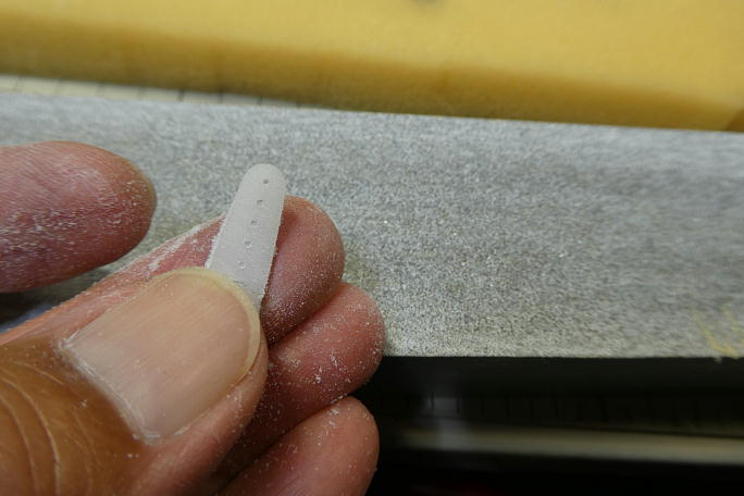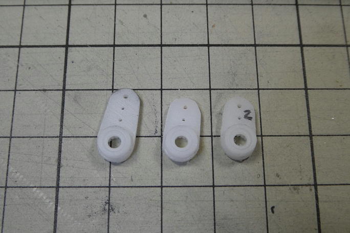 ![]() 樹脂クレビスを使う関係で、サーボホーンの厚みを1.5ミリまで薄くします。 KSTのホーンは、X08用でも厚みが 1.8ミリありますので、そのままではクレビスが脹らんだ状態になってしまいます。 ![]() サーボホーンを加工します。 不要部分を切り落として、整形しておきます。 ![]() サーボホーンの大きさは舵角では無く、リンケージロッドの取り出し口の位置で決めました。 左からエレベーター、ラダー、 フライングテール用です。 ![]() フライングテール用のホーンはエレベーターリンケージと干渉があるので、一番小さい穴を使い、その分サーボの舵角を 大きく取ることにしました。 クレビスがホーンに当たるので、当たる所のホーンの首を削りました。 |