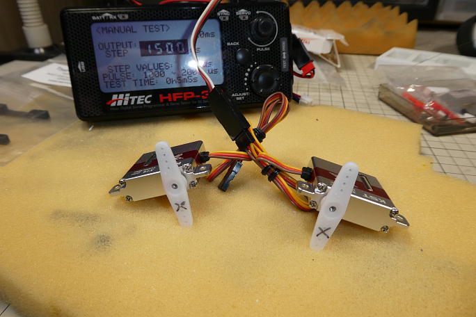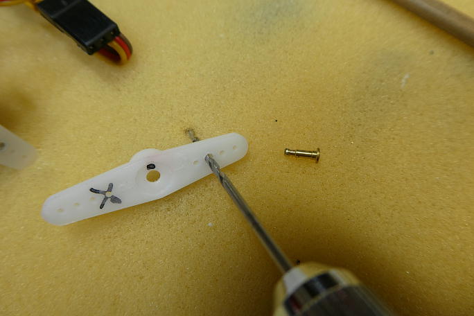![]() 使用する樹脂クレビスにM2のタップで予めネジを切っておきます。 電ドラボールにタップを咥えさせ、正転、逆転を 繰り返して切っていきます。 ![]() 1500μsのニュートラルでサーボと極力直角になるホーン位置を探しておきます。 不要部分になる部位に印を付けて おきました。 ![]() サーボホーンのま穴は中心より11ミリの場所を使います。 ピンに合わせて1.5ミリのドリルで穴を拡大しておきます。 ![]() サーボホーンの不要部分を切り取り、全体を成型しておきます。 成形時にヒゲが出て全体が毛羽立ったように なるものですが、バーナーで軽く炙る事で表面が綺麗になります。 |