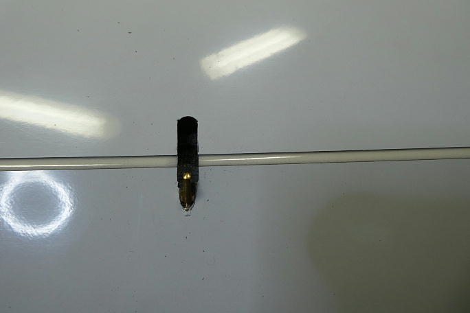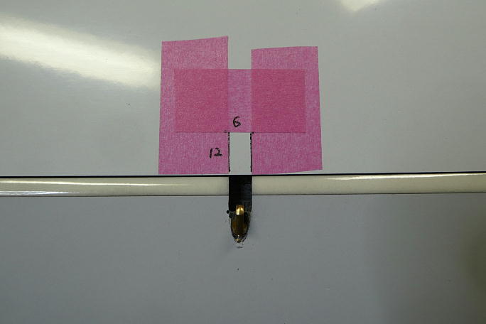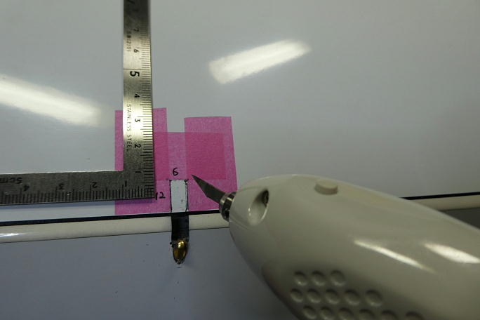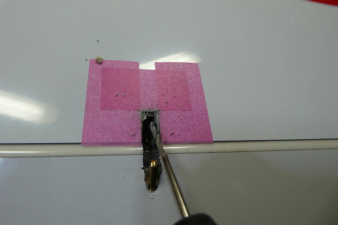 ![]() コントロールロッドの取り出し口は、自分のF3J Xplorer3に習って幅6ミリ、長さ12ミリとしました。 ![]() 表皮は超音波カッターで切り欠きます。 途中、後縁材が当たり、その接着剤(マイクロバルーン入りエポキシ)が粘り ます。 ![]() 切り取りました。 この位置に後縁材が来ています。 ![]() リューターのドリルビットで後縁材にロッドの貫通坑を開け、開口部の整形も行います。 ![]() 後縁材の貫通坑はこの程度、ガッツリ開けておきます。 ![]() 仕上がったロッド取り出し口周りです。 |
