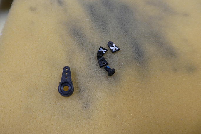 ![]() 1500μsのニュートラルに合わせて、サーボと直角になるサーボホーンの位置を調べます。 奇数スプラインのサーボ あるあるです。 ![]() サーボホーンの不要部分を切り落とし、切り取った部分を成型します。 |