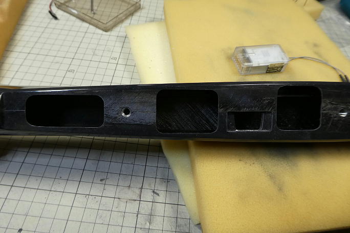 ![]() 胴体の主翼下部がメカスペースで、ザックリと穴開け加工がメーカーにて行われています。 ただ、受信機を始め、 入らない物が出て来ます。 ![]() 受信機スペースと前側のサーボスペースを拡大します。 削る位置をマスキングテープで示しておきます。 ![]() 拡大加工が完了した胴体です。 ![]() 大きめな受信機もスッポリ収まります。 |