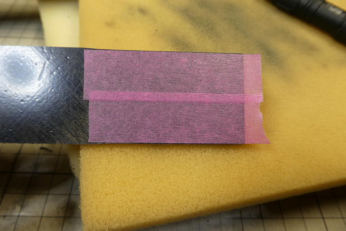 ![]() 胴体のノーズコーン部分とのかみ合わせ部分が若干細くなっていて、そのままではその部分だけ浮き上がってしまい ます。 0.5ミリだけ細くするためにマスキングテープでマーキングをします。 ![]() マーキング部分を削り取った状態です。 |