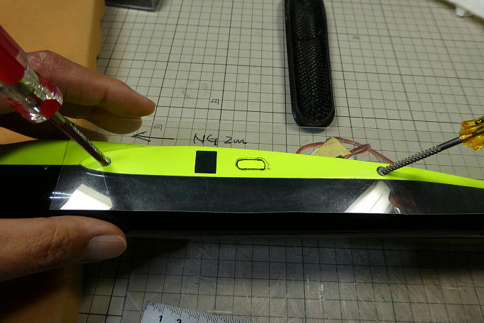 ![]() このキットでは、胴体にエルロンサーボコードの取り出し口が加工されていません。 主翼端面でテンプレートを作り、主翼側のコネクタ位置を写し取ります。 ![]() 主翼端面で作ったテンプレートを胴体に当てて、コネクタ貫通孔の開ける位置を胴体側にマーキングします。 ![]() マスキングテープで周囲を養生して、穴開け加工をしていきます。 ![]() 加工の終わった胴体側面です。 |