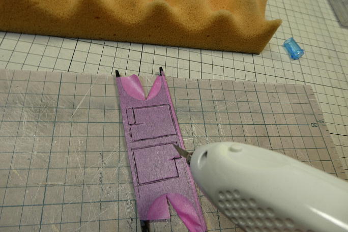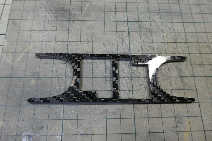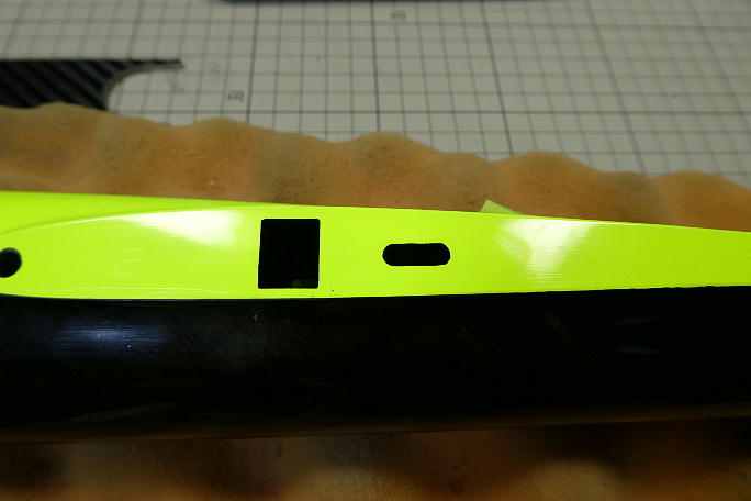 ![]() 付属のサーボマウントにマスキングテープを貼って、サーボの平面をケガいていきます。 カーボン面に直接書き込むと 線が判りにくいので、その対策です。 ![]() 超音波カッターで切り込みます。 ![]() 切り取り、サーボがキッチリはまるように削って調整しました。 |