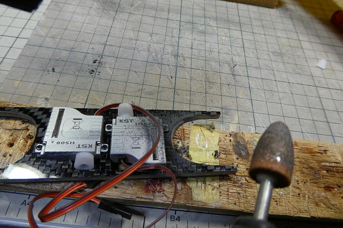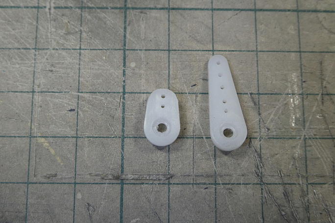 ![]() サーボホーンは小さい方から二つ目の穴を使用します。 他の不要部分は切り取って、成型をしておきます。 ![]() サーボの取り付けねじ穴が1.5ミリ強しかありません。 1.7ミリのタッピングねじを使用するために、取り付け穴を 1.7ミリドリルで拡大しておきます。 ![]() 仮組みをしたところ、まだ削る余地があったので、追加で削り込んでおきます。 |