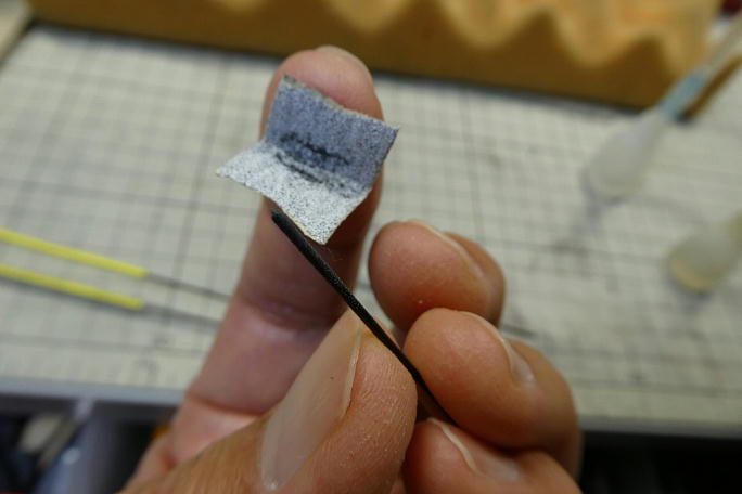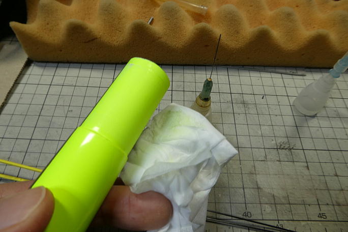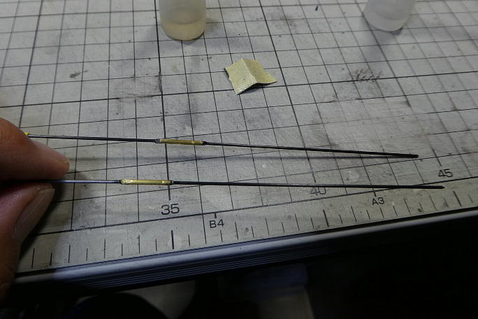 ![]() テールブームとポッドを接着する前にリンケージロッドの延長を行っておきます。 接合後ではとても大変な作業になって しまいます。 キット指示では、胴体内部は1ミリのピアノ線でリンケージをするようになっていますが、ここは手持ちの1ミリのカーボンロッド でリンケージを延長します。 接着するために胴体内の作り付けロッドと延長用のロッドの接着部をサンディングしておきます。 ![]() 付属のアルミパイプで延長します。 アルミパイプは軽くカシメて、低粘度瞬間接着剤を流して接着します。 |